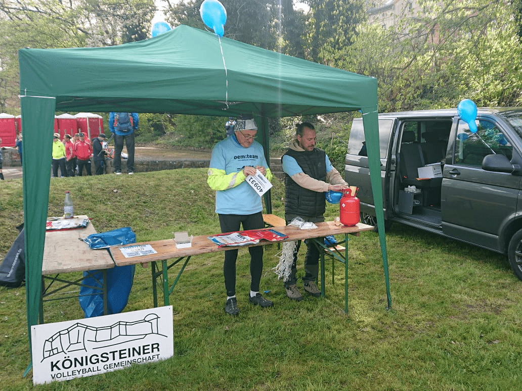 Am 30.04.2023 fand der inzwischen 24. Oberelbe-Marathon statt. Wie jedes Mal seit ca. 2006 unterstützt die Königsteiner Volleyballgemeinschaft diese Laufveranstaltung bei der Organisation und Durchführung im Startbereich. Wir stellen den Pavillion für die Abholung der letzten Startunterlagen und helfen bei der Entgegennahme des Läufer-Gepäcks für den Transport per Lkw zum Ziel. Außerdem steigt das Maskottchen Mobilius immer in unserem Vereinsheim in sein Riesenkostüm. An der Stelle möchte ich Holger Wegner, Ricco Dunsch, Anna Hensel, Maik und Fabian Wiegand danken, die seit vielen Jahren regelmäßig als Helfer dabei sind. Ich organisiere seit 2008 unsere Aktivitäten am Start. Auch Tino Hortsch ist (wenn auch im Dienste der Mittelschule) jedes Jahr dabei.