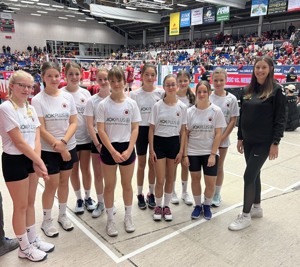 Für die Volleykängurus stand kurz vor dem Jahreswechsel noch ein besonderes Highlight an. Im Spiel der DSC-Damen gegen den USC Münster am 30. Dezember 2023 durften sich die Volleykängurus als Einlaufkinder an der Hand der Spielerinnen zeigen. Ingesamt 10 Spielerinnen dieser Trainingsgruppe nahmen am Event teil. Mit dabei waren Eltern, Geschwister, Großeltern und das Trainer-Team um Till Müller und Clara Möckel.